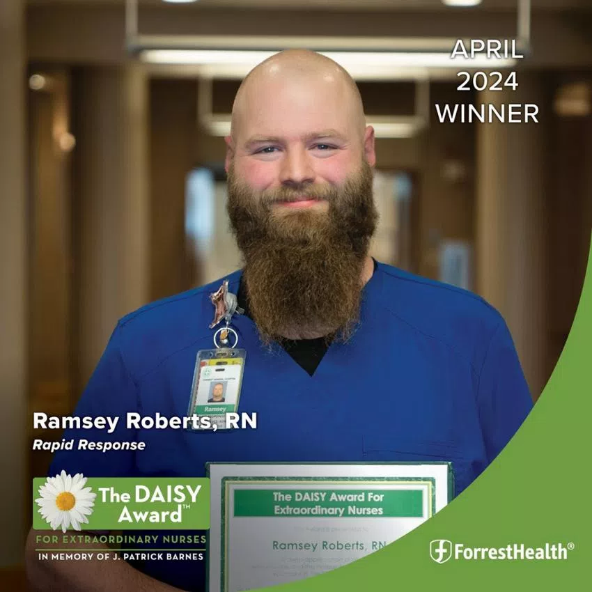 Forrest Health has named Ramsey Roberts, RN, who works in Rapid Response, as its DAISY Award winner for April. The DAISY award, which is presented monthly to a deserving nurse or nurses, exemplifies clinical expertise and compassionate care and is recognized as a role model in the nursing community.