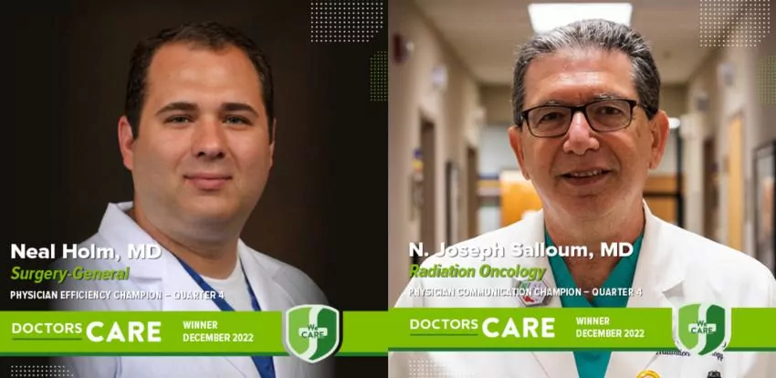 Neal Holm, MD, Surgery, and N. Joseph Salloum, MD, Radiation Oncology, were recognized as the fourth quarter winners of the Forrest General Hospital Doctors CARE Awards. These awards recognize the achievements of physician members of Forrest General Hospital in service and contribution to the patient and physician community.