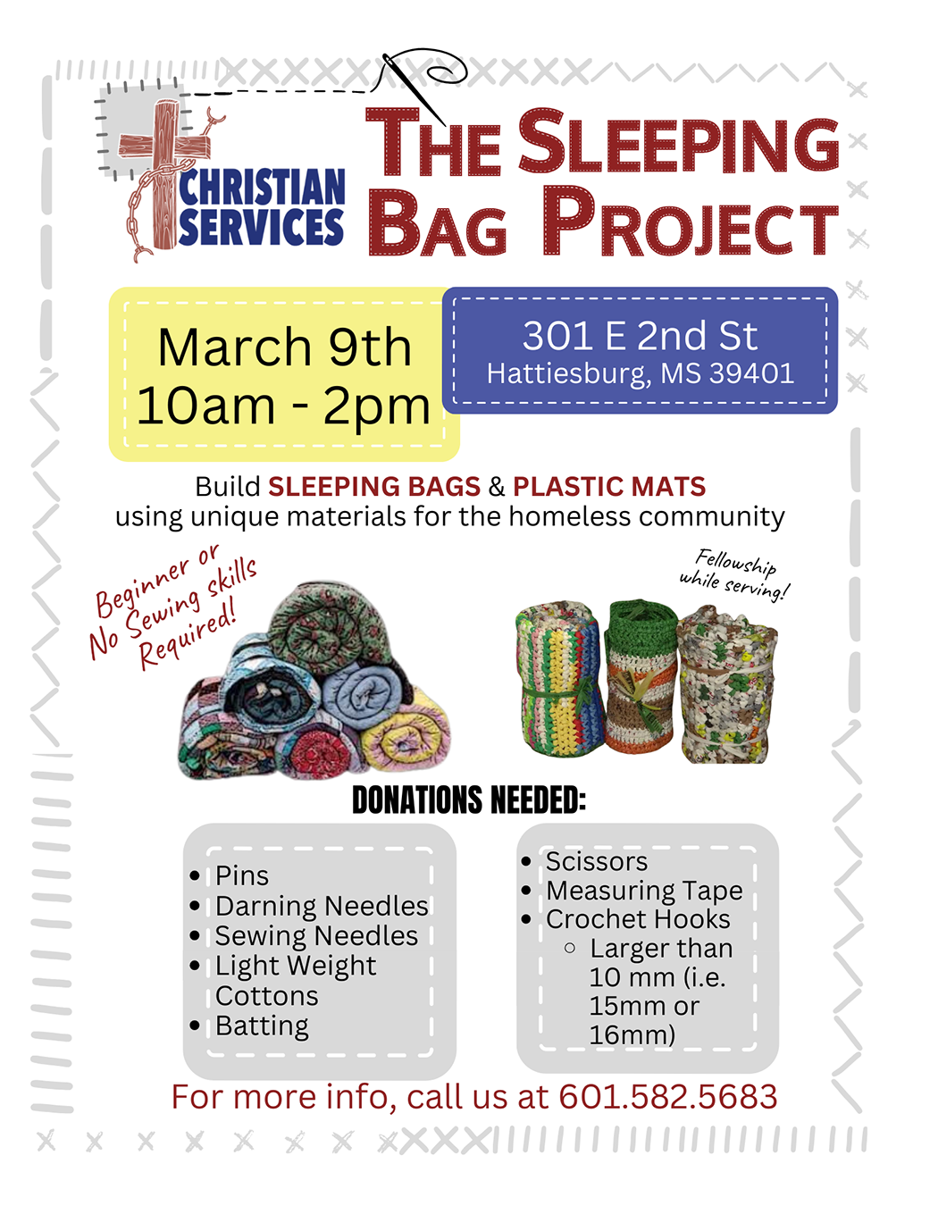 Enjoy fellowship with others while building sleeping bags and plastic mats for those in need in our community. Join Christian Services for another round of The Sleeping Bag Project from 10 a.m. – 2 p.m. on Saturday, March 9 at 301 East 2nd St.