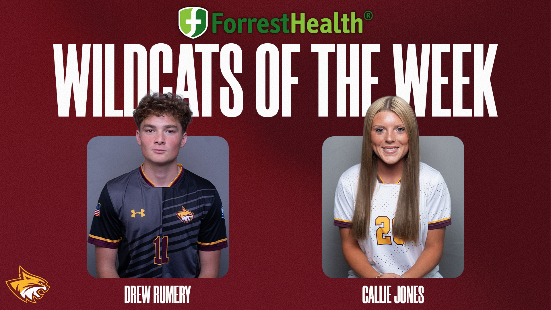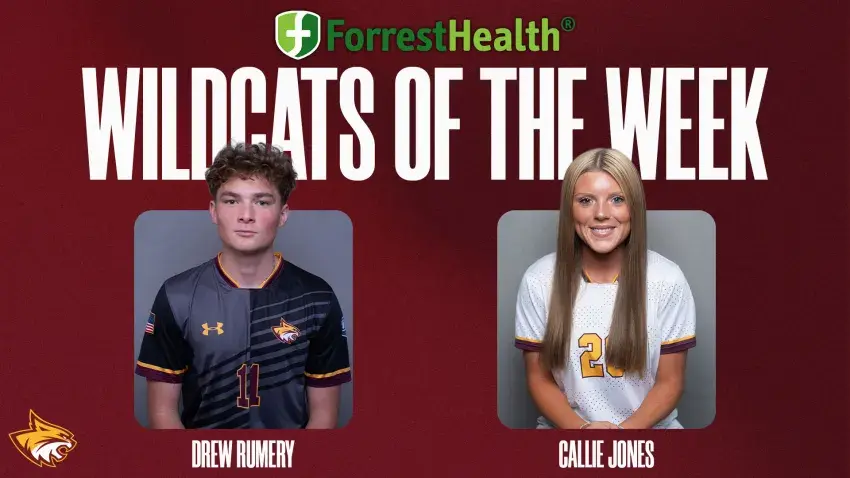 Pearl River men's soccer's Drew Rumery (Ocean Springs) and women's soccer's Callie Jones (Laurel; West Jones) have been named the ForrestHealth Wildcats of the Week for their standout performances.
