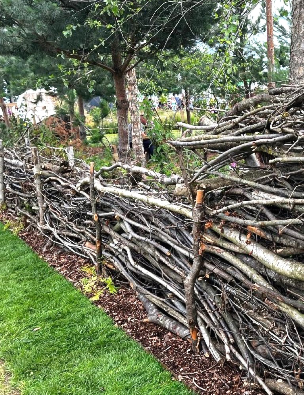But my fav new thing is actually a very ancient practice called a “dead hedge” which is simply a low, narrow fence that weaves through the back of my garden. It is made by pounding stakes in the ground every few feet, in pairs a foot apart, and laying or weaving branches and stuff in between like irregular naturalistic fence railings, interspersed with vines and leaves.