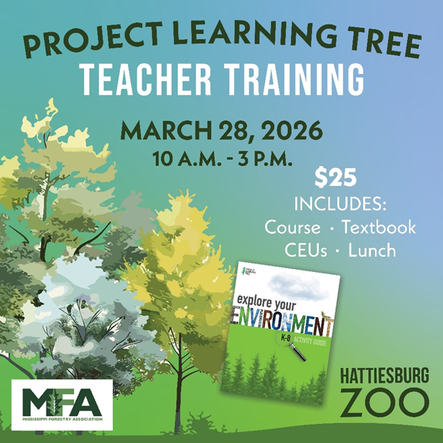 The education team at the Hattiesburg Zoo has partnered with the Mississippi Forestry Association to present a Project Learning Tree training session for formal and informal teachers on March 28th from 10:00 a.m. – 3:00 p.m.