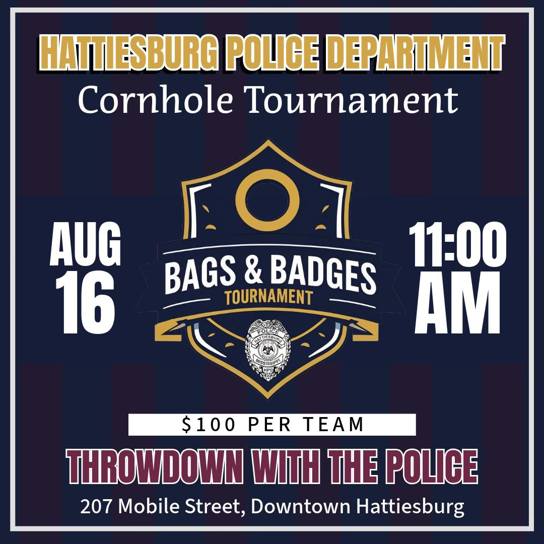 Hattiesburg Police Department is partnering with Forrest County Sheriff’s Office and Hattiesburg Fire Department to host the inaugural “Bags & Badges” Cornhole Tournament. In addition to the cornhole tournament, there will be food, drinks, music and the opportunity to dunk an officer in a dunking booth. The public is invited to test their aim and nerve against local first responders on Aug. 16 at 11 a.m.