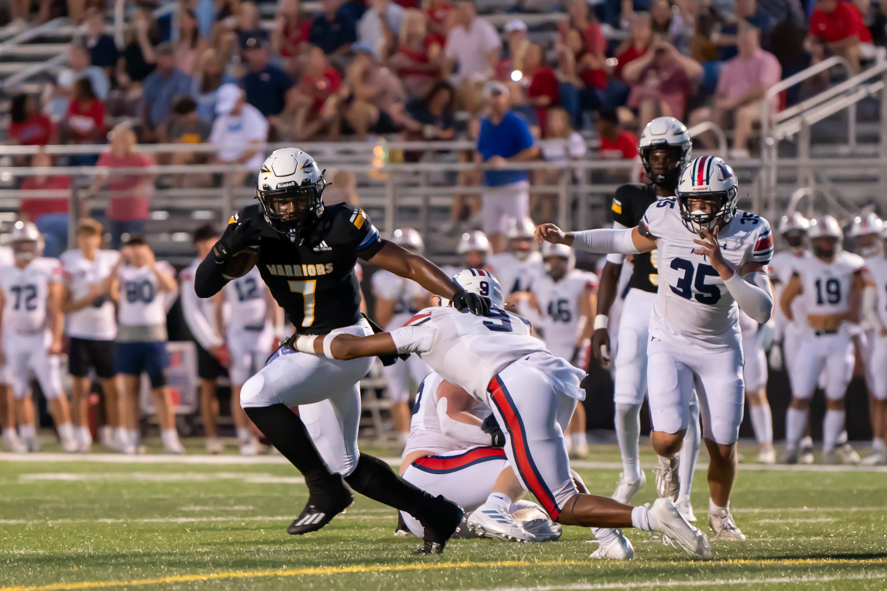 On the ensuing drive for MRA (4-2), White diced through the Warrior defense with over-the-middle throws, sideline throws and swing passes to lead MRA on their second straight scoring drive. The drive finished with Patriots running back Charles Simpson breaking three tackles and scoring on a seven-yard rushing touchdown.