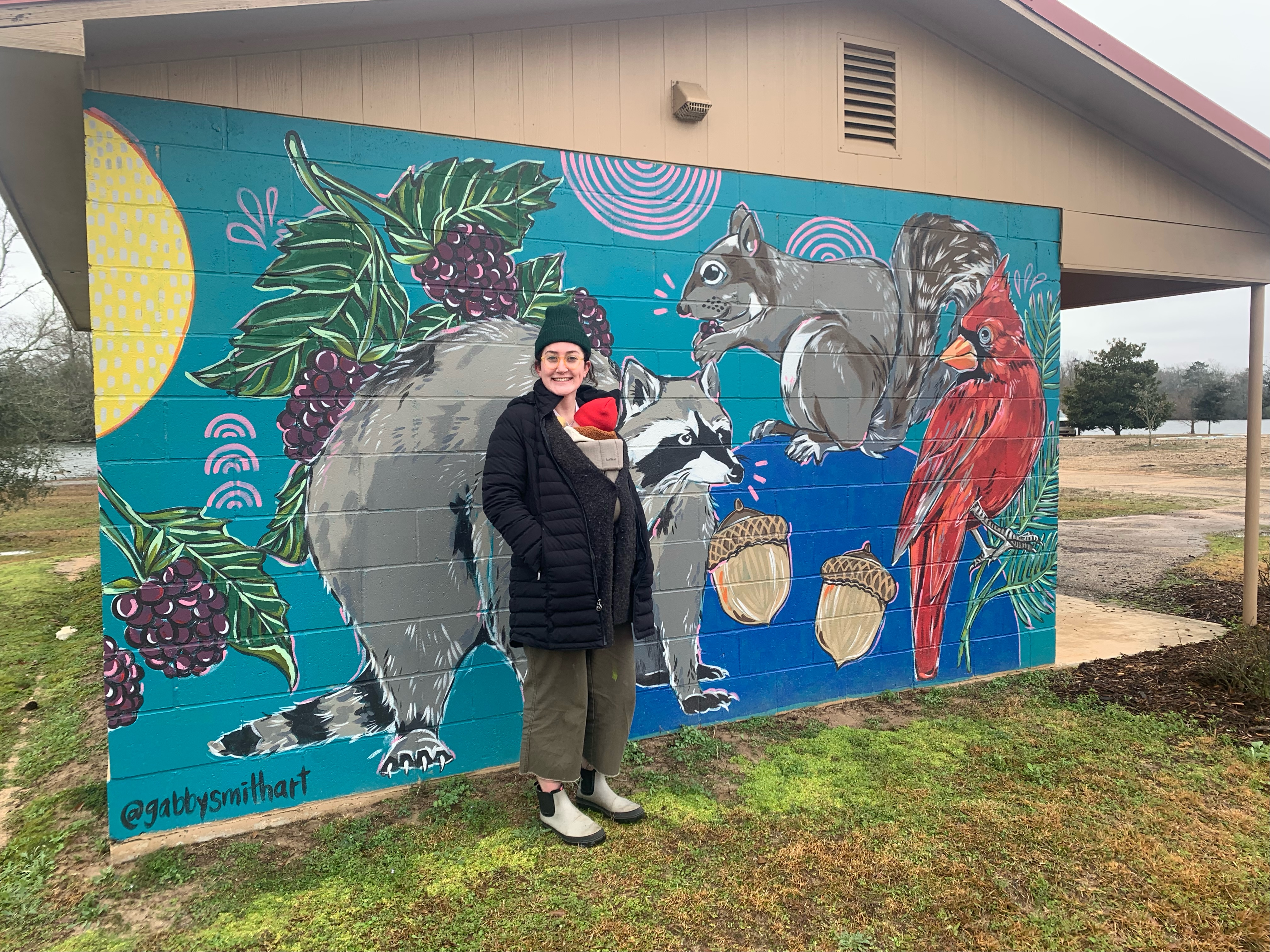 The 500-square-foot mural, which was completed by muralist Gabriele Smith, features such items as grape clusters, a raccoon, a Grey Squirrel and a Northern Cardinal set against a blue background.