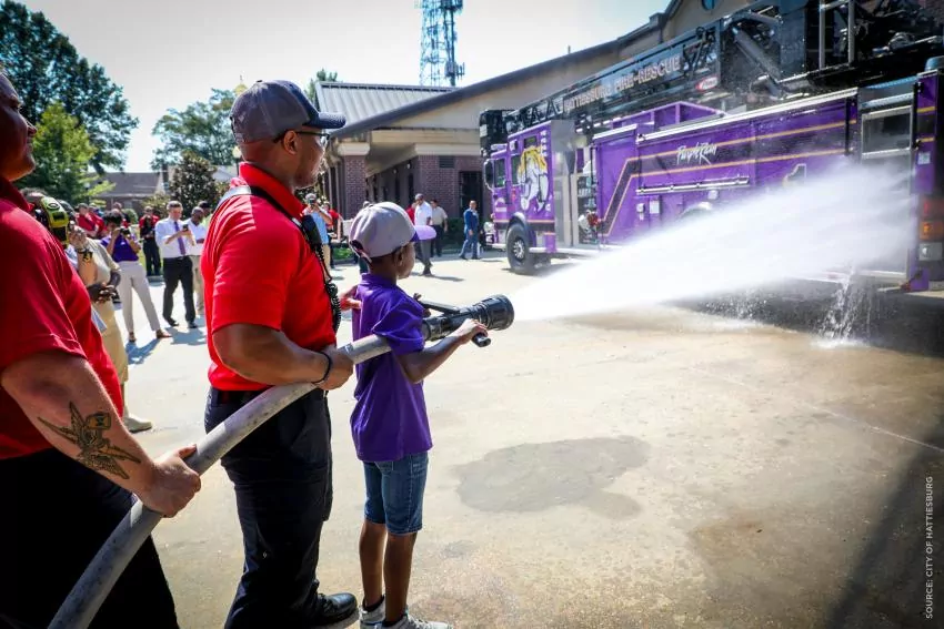 The truck, named “Purple Rain” and painted with the purple and yellow colors of the Hattiesburg Public School District, was unveiled during a September 7 ceremony at Fire Station No. 1 on North Main Street in downtown Hattiesburg. The engine features the words “Hattiesburg Fire Rescue” on the ladder, along with the “Purple Rain” name and the Tigers logo on the cab.