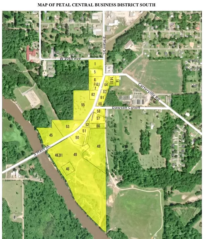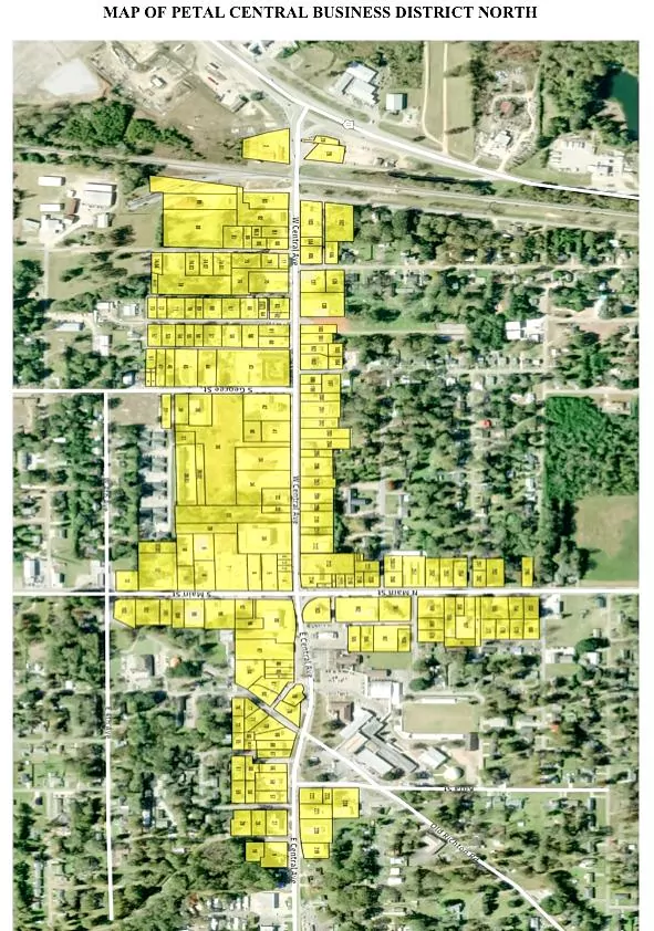 The area is broken down into two sectors: Petal Central Business District North, which runs east of U.S. 11 toward Old Richton Road, and the Petal Central Business District South, which runs along South Main Street at West 10th Avenue and goes toward the Leaf River. The north district is comprised of several parcels off of West Central Avenue, East Central Avenue, South George Street, North Main Street and South Main Street. The southern district consists mostly of parcels off of Carterville Road, Dawson Cutoff and South Main Street.