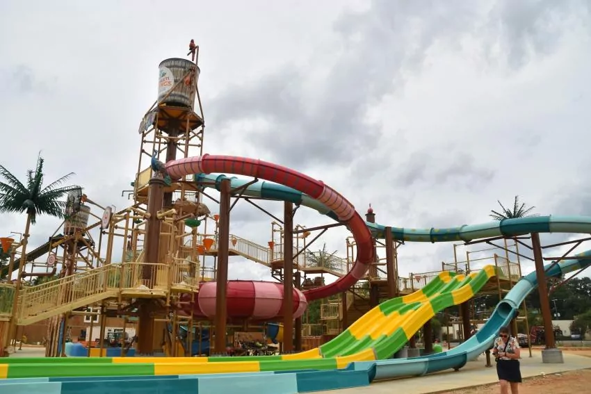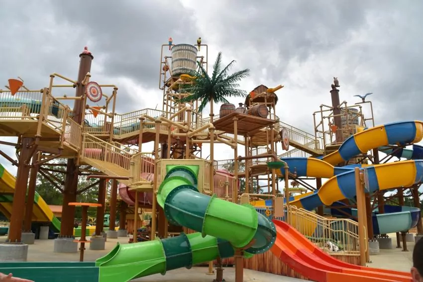 Construction of the water park is taking place in two phases. Work on the current Phase I, which began last summer, will include the aforementioned Fusion Fortress Water Play Structure, an entry building with a gift shop and showers, a 150,000-gallon lazy river, a swim-up pool and bar, group pavilions, cabanas, food trucks, a staff office building, and loungers and Adrirondack chairs. The Fusion Fortress will consist of nine slides of varying heights, along with multiple water play areas and two bucket dump stations.