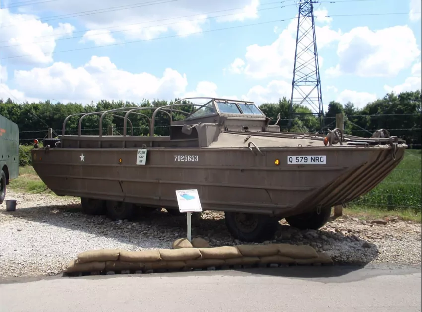 The DUKW is a six-wheel drive amphibious truck used in World War II and the Korean War to transport goods and troops over land and water. The name DUKW comes from General Motors Corporation nomenclature and signifies D as the 1942 production series, U as utility, K as all-wheel drive and W as tandem rear axles.