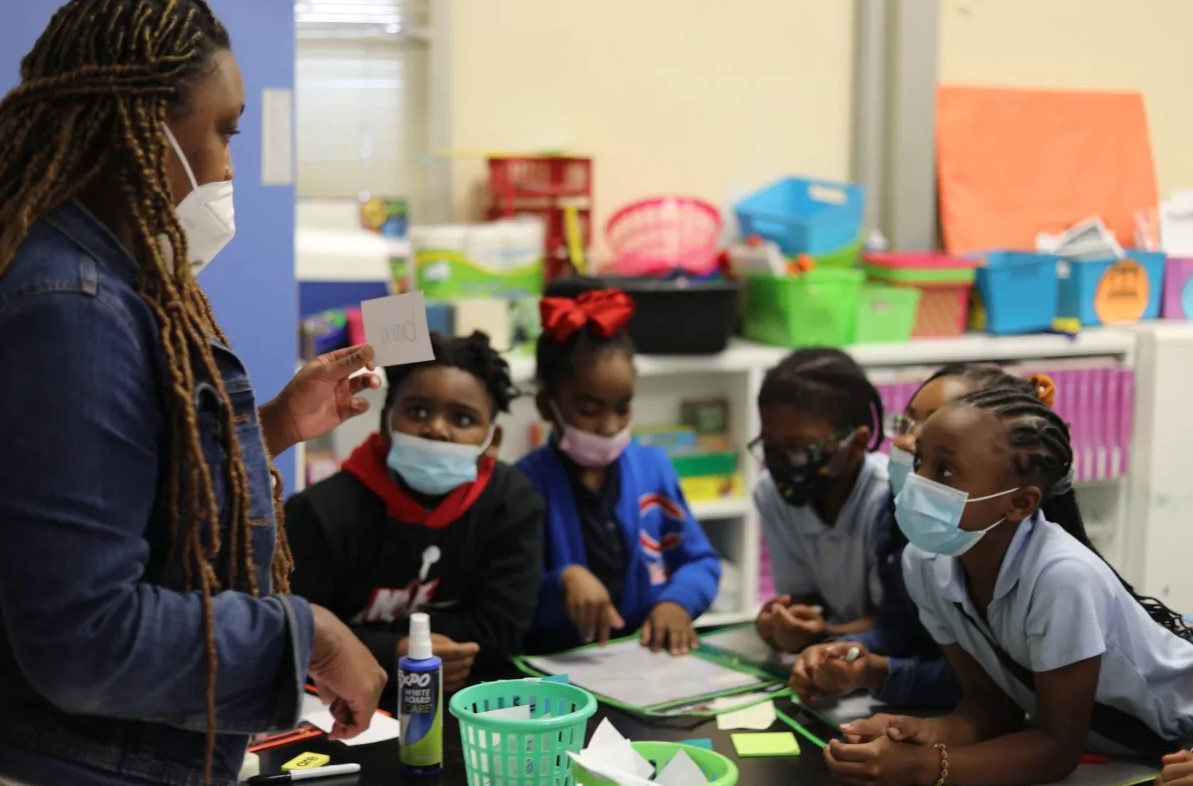 Taurean Morton, state director of Reading Roadmap, helps students practice sounding out the first letter in a word during the afterschool literacy program in the Mississippi Delta, Oct. 10, 2023. Credit: Julia James/Mississippi Today