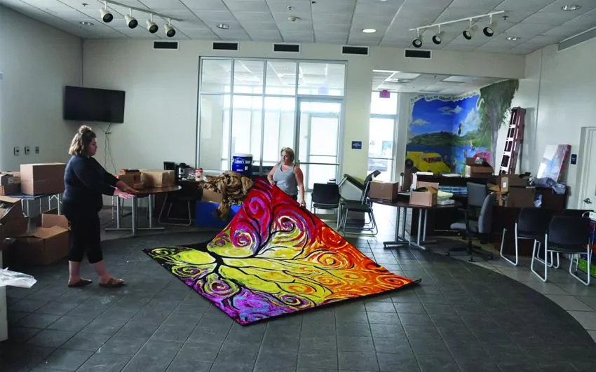 I like the new decorations. There’s a huge rug with a design based on Vincent van Gogh’s “Starry Night” painting. One of the people moving things around (I think she’s a volunteer, but she may very well be an employee either of Pine Belt Mental Health, or of the city) has painted over some of the Ford Motor Co. verbiage on a mural in the entryway.