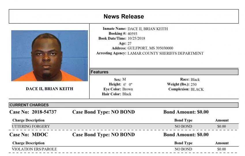 Lamar County Sheriff Danny Rigel said deputies arrested 27-year-old Brian Keith Dace II - also known as Brian Davis - on Oct. 25 and charged him with one count of forgery, parole violation and receiving stolen property.