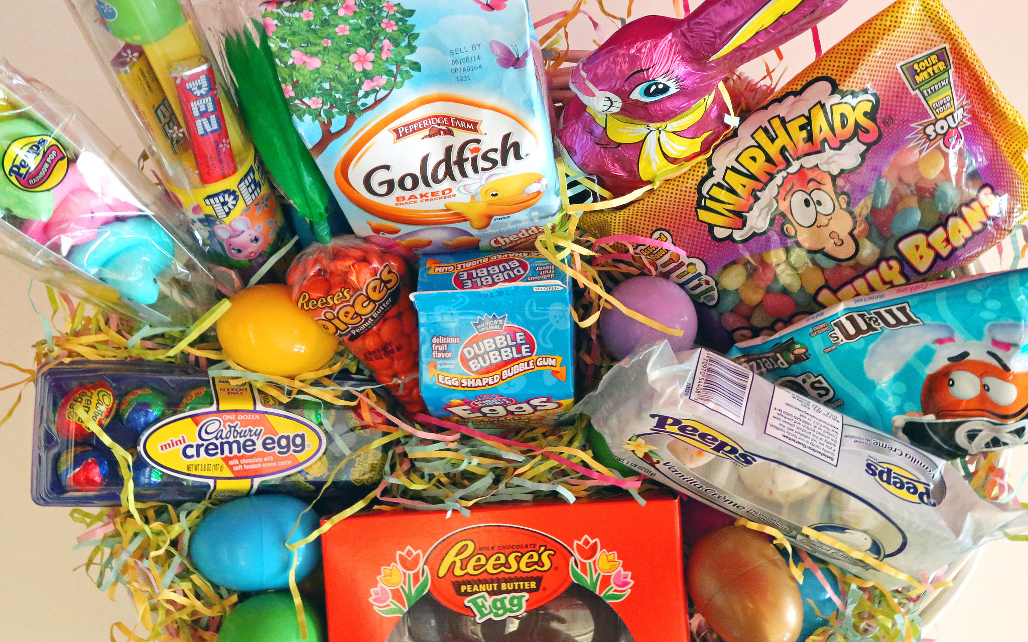 Tucked inside the baskets were copious amounts of common, everyday plastic Easter grass loaded to the hilt with several pounds of those tiny Cadbury easter eggs - the football-shaped ones wrapped in shiny foil.