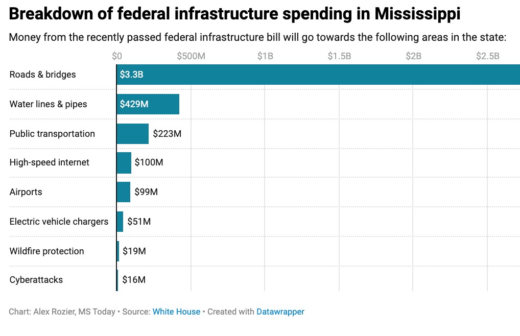Mississippi will receive about $3.3 billion for federal-aid highway apportioned programs and $225 million for bridge replacement and repairs under the Infrastructure Investment and Jobs Act over five years. This money can be spent, among other things, on replacement and repairs for both federal and state highways in Mississippi.