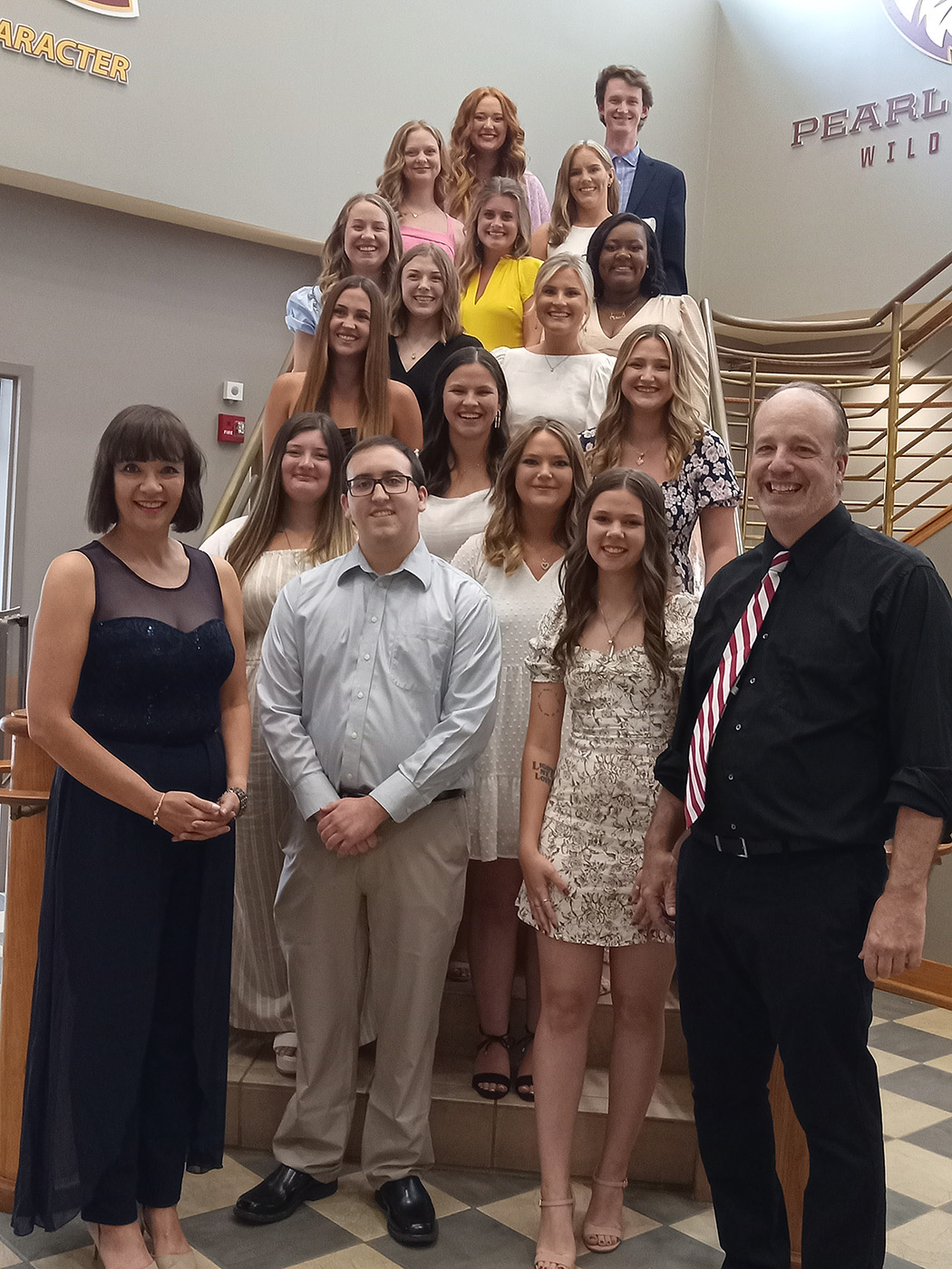 They include from left: First row - Michelle Haynes, Academic Fieldwork Coordinator; James Mallard of Hattiesburg, Valerie Navis of Lumberton and Tim Pulver, OTA program director. Second row - Haleigh Fitzgerald of Pearl and Lindsey Philyaw of Poplarville. Third row – Kelsey Devore of Carriere and Abbie Errington of Jayess. Fourth row – Madeline Barnes of Hattiesburg and Camryn Lyons of Slidell, La. Fifth row – Emily Krol of Picayune and Summer Henry Moore of Decatur. Sixth row – Karrai Jackson of Hattiesburg and Gracie Grimes of Vancleave. Seventh row – Kaylyn Bryant of Petal and Crosby Stevens of Inverness. Top row – Hallie Creel of McComb and Tanner Polk of Jayess.
