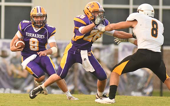 The Tornadoes needed a 2-point conversation late in the fourth quarter to push the game to overtime, then after the Tigers scored a touchdown but unsuccessful on the 2-point play, Purvis scored a touchdown on fourth down and made the point-after-attempt to finish the comeback.
