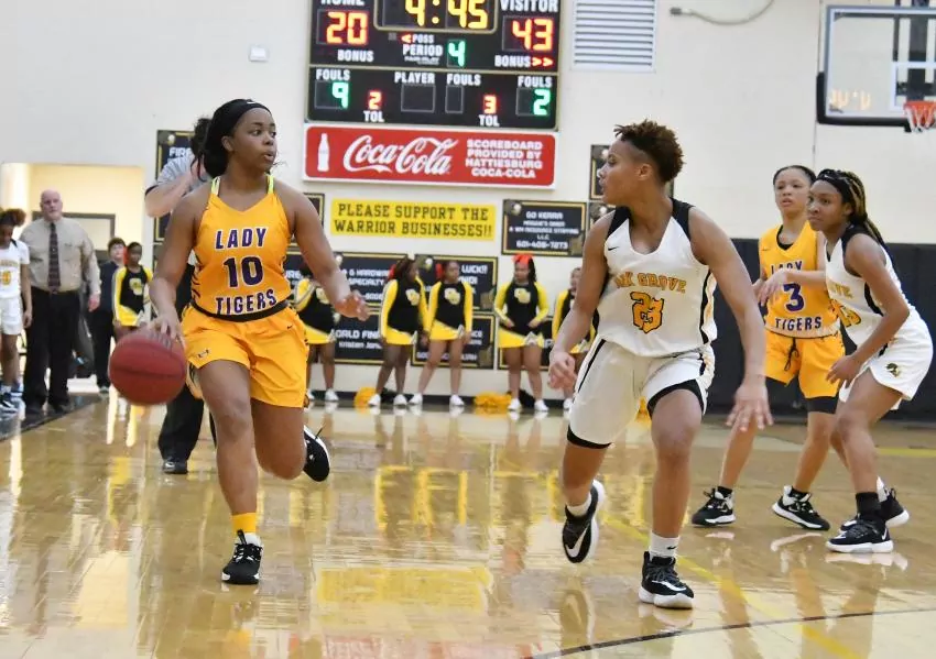 Out of the half, Hattiesburg (12-6) opened with an 18-0 run. In the first half, Oak Grove kept Melyia Grayson in check by defending the paint. However, the Tigers perimeter shooting found life as Hattiesburg nailed six 3-pointers and forced the Lady Warriors (13-8) to expand its defense. This allowed for Grayson to dominate the paint and score 13 of her 15 team-leading points in the second half.