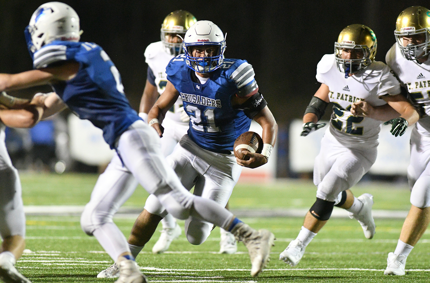 Known for its rushing attack, St. Patrick was met at the line of scrimmage by the Crusaders’ defensive line all game. Coming in to the game averaging nearly 200 yards per game on the ground, the Irish only had 57 rushing yards Friday night.
