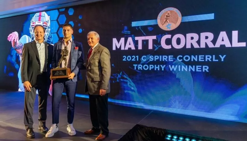 Despite battling injuries, Corral, a junior, led the Rebels to a 10-2 season, throwing for 20 touchdowns and running for 11 more on the way to becoming a legit candidate for the Heisman Trophy. He won the Conerly Trophy over other finalists Will Rogers of Mississippi State and Shedeur Sanders of Jackson State, both with eye-popping stats of their own. Corral received a standing ovation from the crowd in the packed ballroom at Country Club of Jackson.