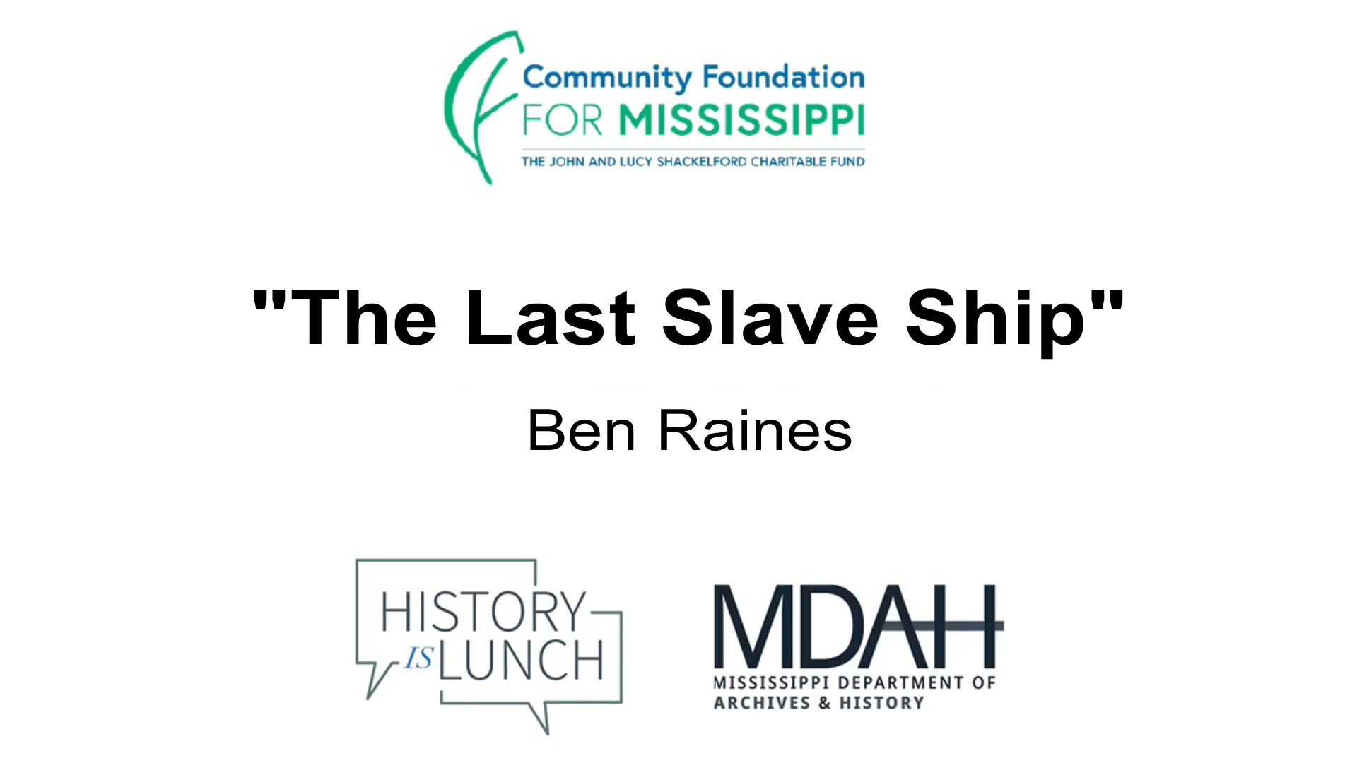 On August 17, 2022, Ben Raines presented “The Last Slave Ship–The Clotilda, Her Descendants, and an Extraordinary Reckoning” as part of the History Is Lunch series.