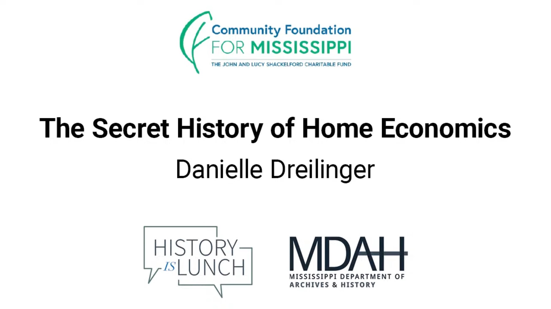 History Is Lunch is sponsored by the John and Lucy Shackelford Charitable Fund of the Community Foundation for Mississippi. The weekly lecture series of the Mississippi Department of Archives and History explores different aspects of the state's past. The hour-long programs are held in the Craig H. Neilsen Auditorium of the Museum of Mississippi History and Mississippi Civil Rights Museum building at 222 North Street in Jackson and livestreamed on YouTube and Facebook.