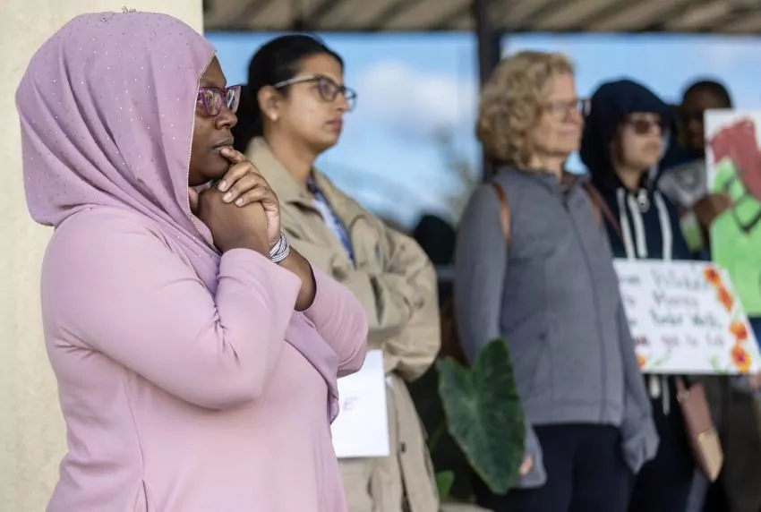 Candace Abdul-Tawwab, left, listens as Okolo Rashid gives her thoughts on the Israeli–Palestinian conflict during a pro-Palestine rally at the International Museum of Muslim Culture in Jackson, Miss., on Monday, Oct. 16, 2023. Credit: Eric J. Shelton/Mississippi Today
