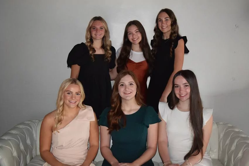 Maids seated from left to right are Gracie Bennett, Ella White, and Raylee Stewart. Maids standing from left to right are Kara Cooper, Kennis Hawthorn, Alissa Miller, Kalyn Hawthorn, Caroline Keener, and Linley Fortenberry.
