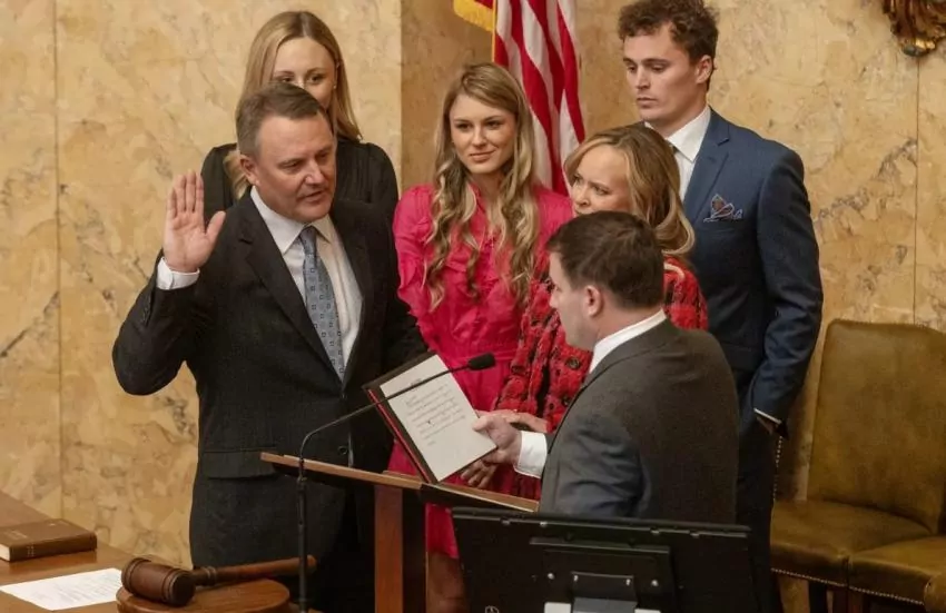 Rep. Jason White, R-West, left, recites the oath of office as House Speaker for the Mississippi House of Representatives during the first day of the Legislative Session at the Capitol building in Jackson, Miss., Tuesday, Jan. 2, 2024. Credit: Eric J. Shelton/Mississippi Today