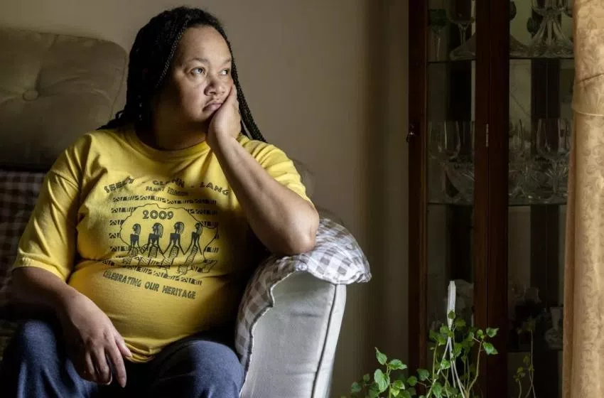 Selinda Walker, 47, looks out of the window at her mother's house in Columbus, Miss., on Thursday, April 18, 2024. Unable to access necessary care, including tests, treatment, and potentially surgery to manage her Graves' disease, she was forced to quit working, leading to her return to live with her elderly mother. Credit: Eric Shelton/Mississippi Today
