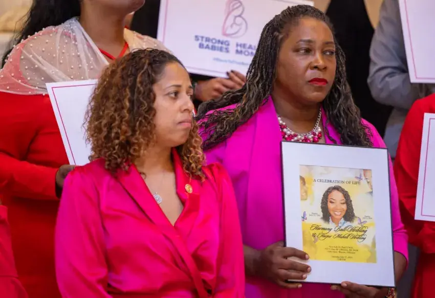 State Rep. Timaka James-Jones, right, holds a photo of her late niece, Harmony Ball-Stribling, during a press conference for Black Maternal Health Week at the Mississippi Capitol in Jackson, Miss., on Monday, April 14, 2025. Ball-Stribling and her unborn daughter, Harper, died in 2021 after a medical emergency in a rural community without 24-hour emergency care. James-Jones joined advocates in calling for improved maternal health policies across Mississippi. Credit: Eric Shelton/Mississippi Today