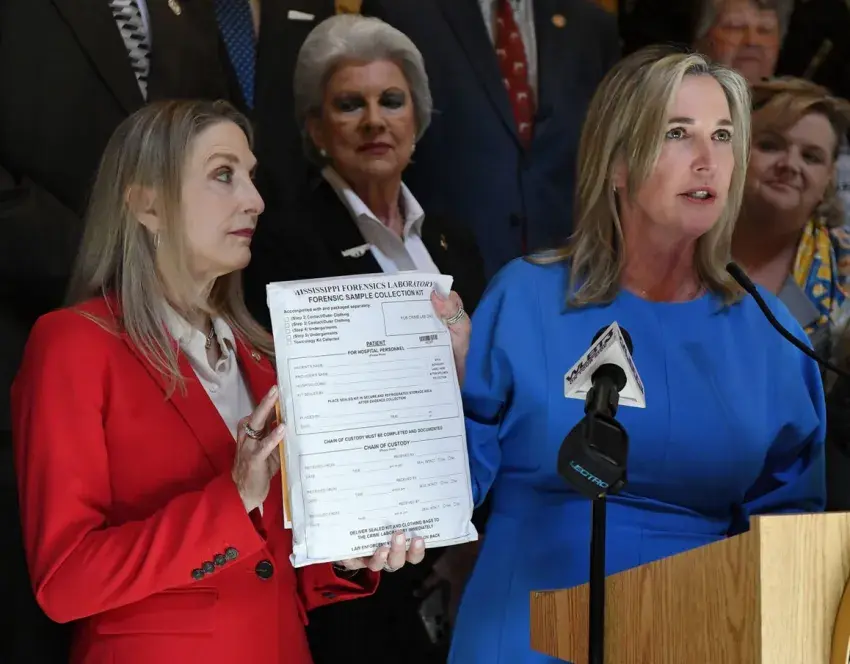Rep. Dana McLean, R-Columbus (left) and Center for Violence Prevention Exec. Dir. Sandy Middleton, holding a rape kit, were joined by sexual assault advocates, legislators, members of law enforcement, urging legislators to take another look at House Bill 928, requiring kits and better care for victims of rape, Monday, March 10, 2025 at the State Capitol. Credit: Vickie D. King/Mississippi Today