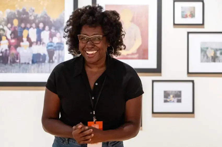 Artist Alexis McGrigg talks about her piece “A Personal Constellation” during a media preview at the Mississippi Museum of Art on Thursday, June 26, 2025, in Jackson, Miss. McGrigg’s work is featured in the exhibit “Call Home.” Credit: Eric Shelton/Mississippi Today