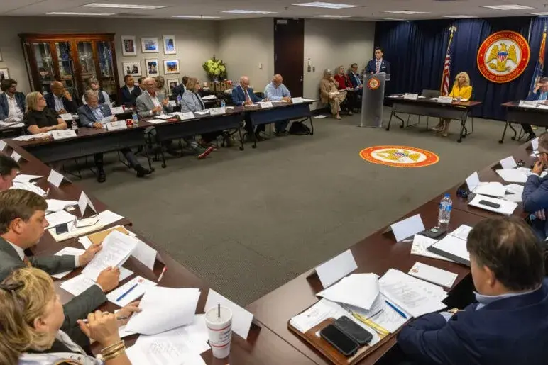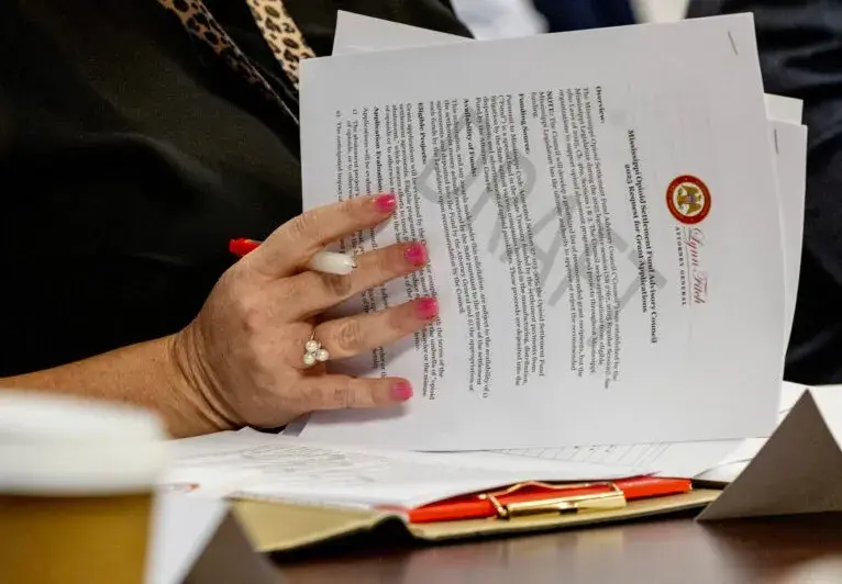 Special Assistant Attorney General Caleb Pracht, left, and Attorney General Lynn Fitch listen as committee members introduce themselves during the first meeting of the Mississippi Opioid Settlement Advisory Committee at the Walter Sillers Building in Jackson, Miss., on Wednesday, July 9, 2025. Credit: Eric Shelton/Mississippi Today