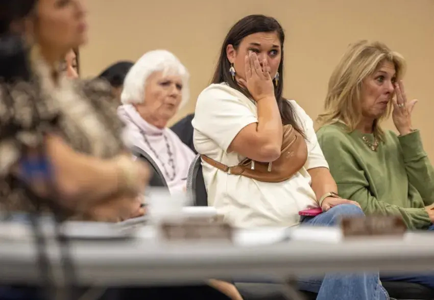 Clarksdale Municipal School District students Leah Myles, Jamarick Davis, Khloe Reed and instructor Candace Barron pose for a photograph after their last teacher preparation class before winter break, Dec. 15, 2025. Their district offers a vocational teacher preparation course at the Carl Keen Career and Technical Center. Credit: Leonardo Bevilacqua/Mississippi Today