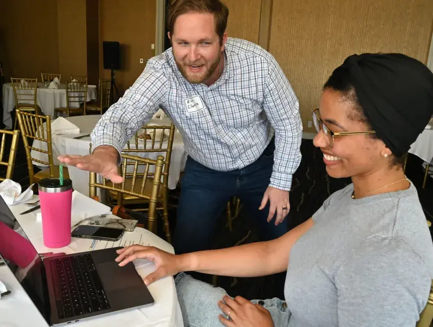 Entrepreneurs from across the state, including Ricky Romanek with Claimtra (left) and Lena Horne, engagement manager with the Beanpath, share a light moment while attending an Innovate Mississippi incubator event held at the Capital Club to promote startup companies, Tuesday, Oct. 7, 2025 in Jackson. Credit: Vickie D. King/Mississippi Today