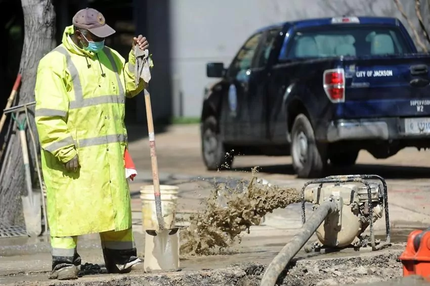 A city of Jackson Water Maintenance crew works to repair a broken waterline Match 6, 2021, on Pascagoula Street. Crews continue to repair the waterlines across the city in order to restore water to homes after severe winter storms crippled the city and state. Credit: Vickie D. King/Mississippi Today