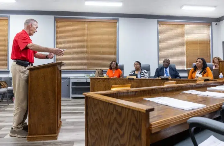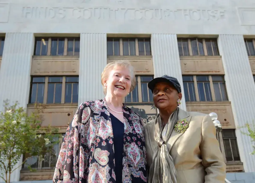 Marilyn Hetrick (left) and Cynthia Johnson Walker, outside the Hinds County Courthouse, shortly before the beginning of an evidentiary hearing regarding whether or not David Archie filed an election challenge before the deadline, Wednesday, Aug. 27, 2025, in Jackson. Credit: Vickie D. King/Mississippi Today