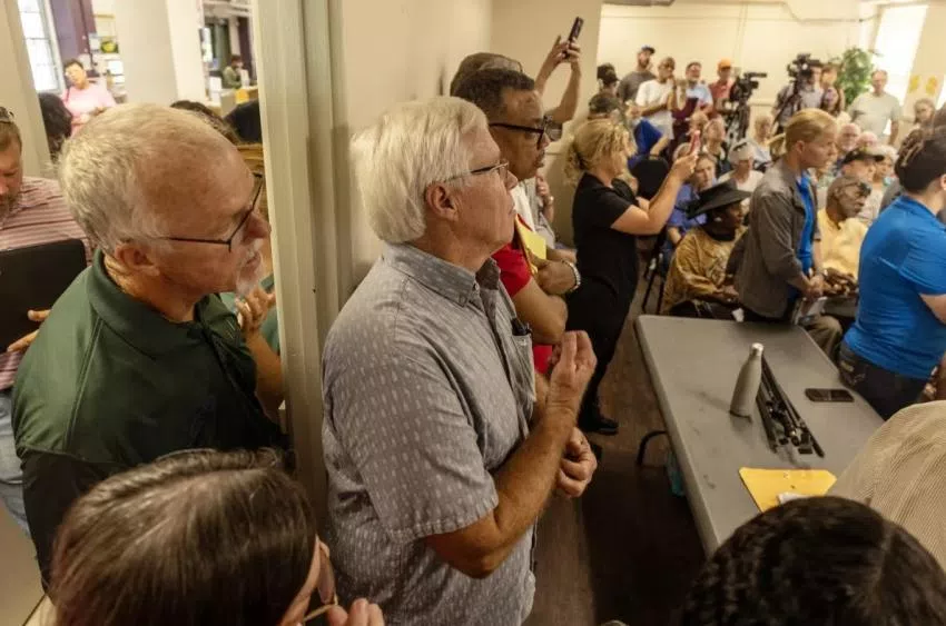 Raymond residents listen as representatives from Apex Clean Energy answer questions about the Soul City Solar project during a Hinds County Planning Commission meeting at the Raymond Library on Tuesday, May 28, 2024. Credit: Eric Shelton/Mississippi Today
