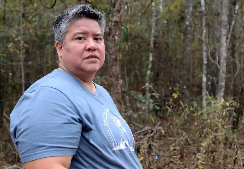 Mitzi Reed, invasive species coordinator for the Native American Fish and Wildlife Society, in one of her favorite places, a swamp area surrounding Beaver Creek Road, adjacent to the Pearl River on Choctaw land, Friday, Nov. 17, 2023. Reed is also a biologist, conservationist, and a member of the Mississippi Band of Choctaws, helping to preserve Choctaw culture and customs, and inspiring the youngsters to get outside. Credit: Vickie D. King/Mississippi Today