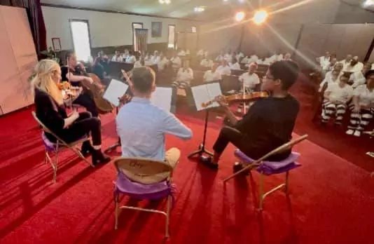 Members of the String Quartet of the First Baptist Church of Jackson recently performed 30 arrangements of music for 68 inmates at the Central Mississippi Correctional Facility in Pearl. The musicians included Noelani Perry, first violinist; Zakary Joyner, second violinist; Rebecca Franklin, viola; and Sarah Beth Mullen, cello.