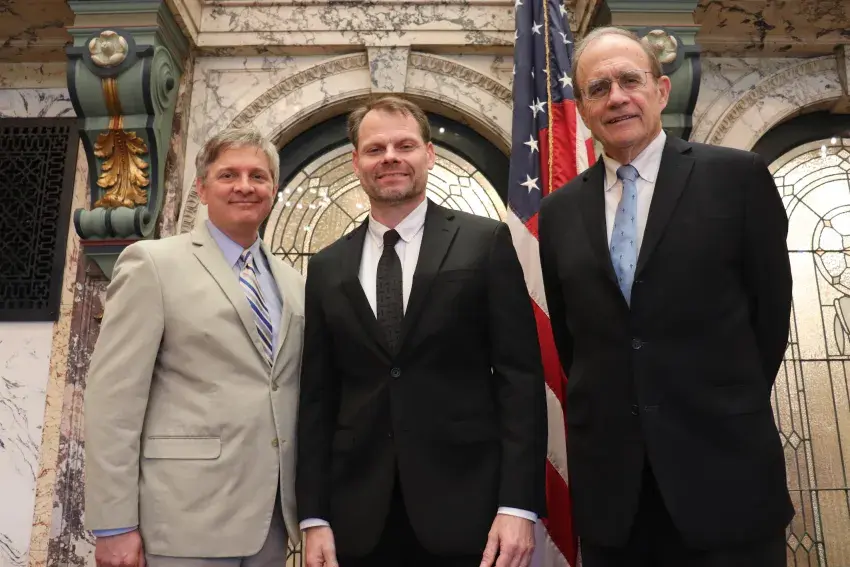 Reverend Dr. Chuck Meador, (center), Pastor of Sumrall Methodist Church, delivered an opening prayer to the Mississippi Senate on Monday, March 31, 2025, at the invitation of Senator Joey Fillingane, who led the Pledge of Allegiance before Lt. Governor Delbert Hosemann guided lawmakers through the day’s agenda.