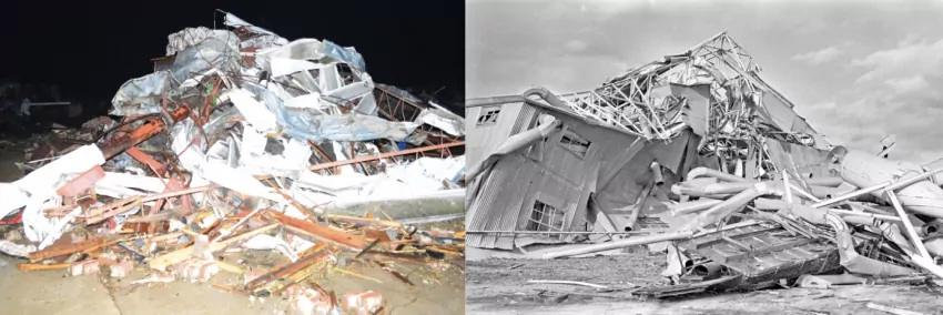Pictured left is what remains of a Rolling Fork business along Highway 61. The Enterprise-Tocsin tracked the monster storm last Friday evening and was able to capture this image, and others, moments after the devastating tornado destroyed the south Delta town. Pictured to the right is the former Duncan Gin in Inverness, captured by former E-T publisher Jim Abbott the day after a similar twister hit Inverness on February 21, 1971. The tornado that hit Inverness was classified as an EF5, while the preliminary ranking for the long track tornado last Friday night is an EF4, according to the National Weather Service. More coverage appears on Pages 10-14.