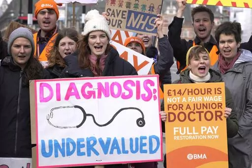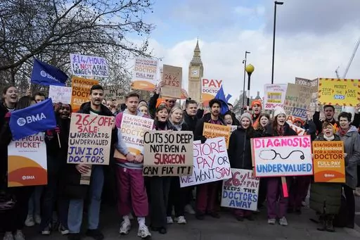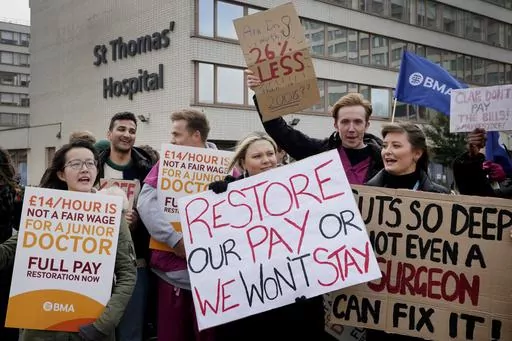 LONDON (AP) — Tens of thousands of junior doctors went on strike across England on Monday to demand better pay, kicking off three days of widespread disruption at the U.K.'s state-funded hospitals and health clinics.