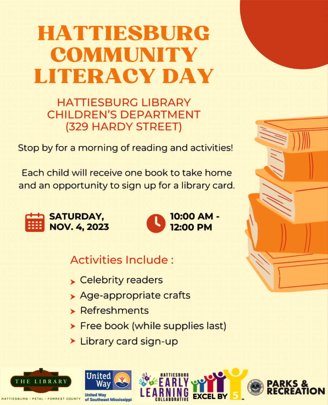 In partnership with the City of Hattiesburg Parks & Recreation, Hattiesburg Early Learning Collaborative, Hattiesburg Excel by 5, and the Library of Hattiesburg, Petal, and Forrest County, United Way of Southeast Mississippi will host a Community Literacy Day on Saturday, November 4, 2023, from 10 a.m. to noon at the Hattiesburg Library Children’s Department. This event invites families with children of all ages to stop by for a morning of reading, crafting, and refreshments. Local “celebrities” have volunteered to read aloud to guests. Participants will receive a free book while supplies last and will have an opportunity to sign up for a library card.