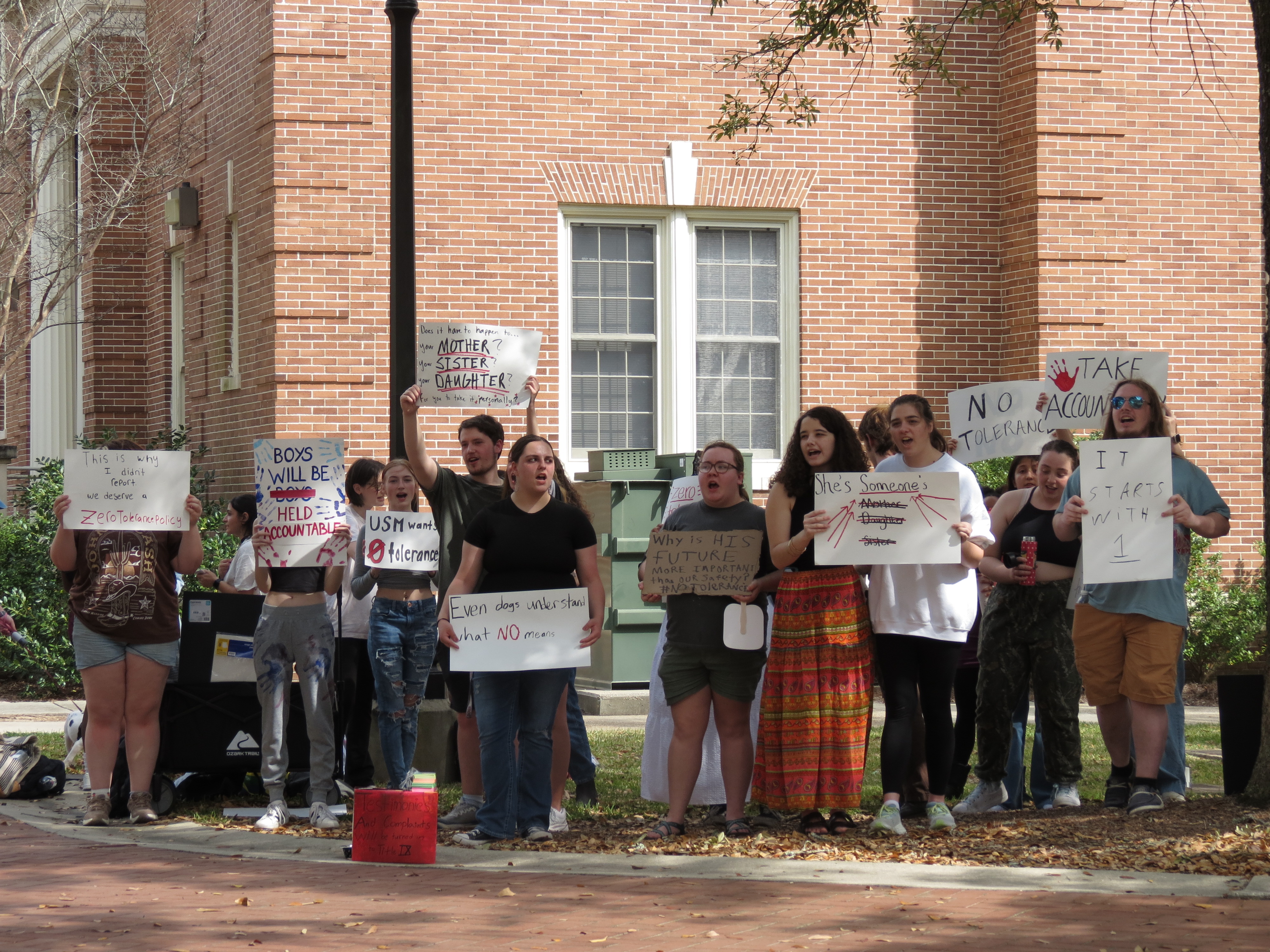 Students gathered on the campus of the University of Southern Mississippi on Thursday to protest the college’s lack of a zero-tolerance policy regarding sexual misconduct. Under the supervision of USM’s police department, protesters chanted, “Zero-tolerance- To the Top!”